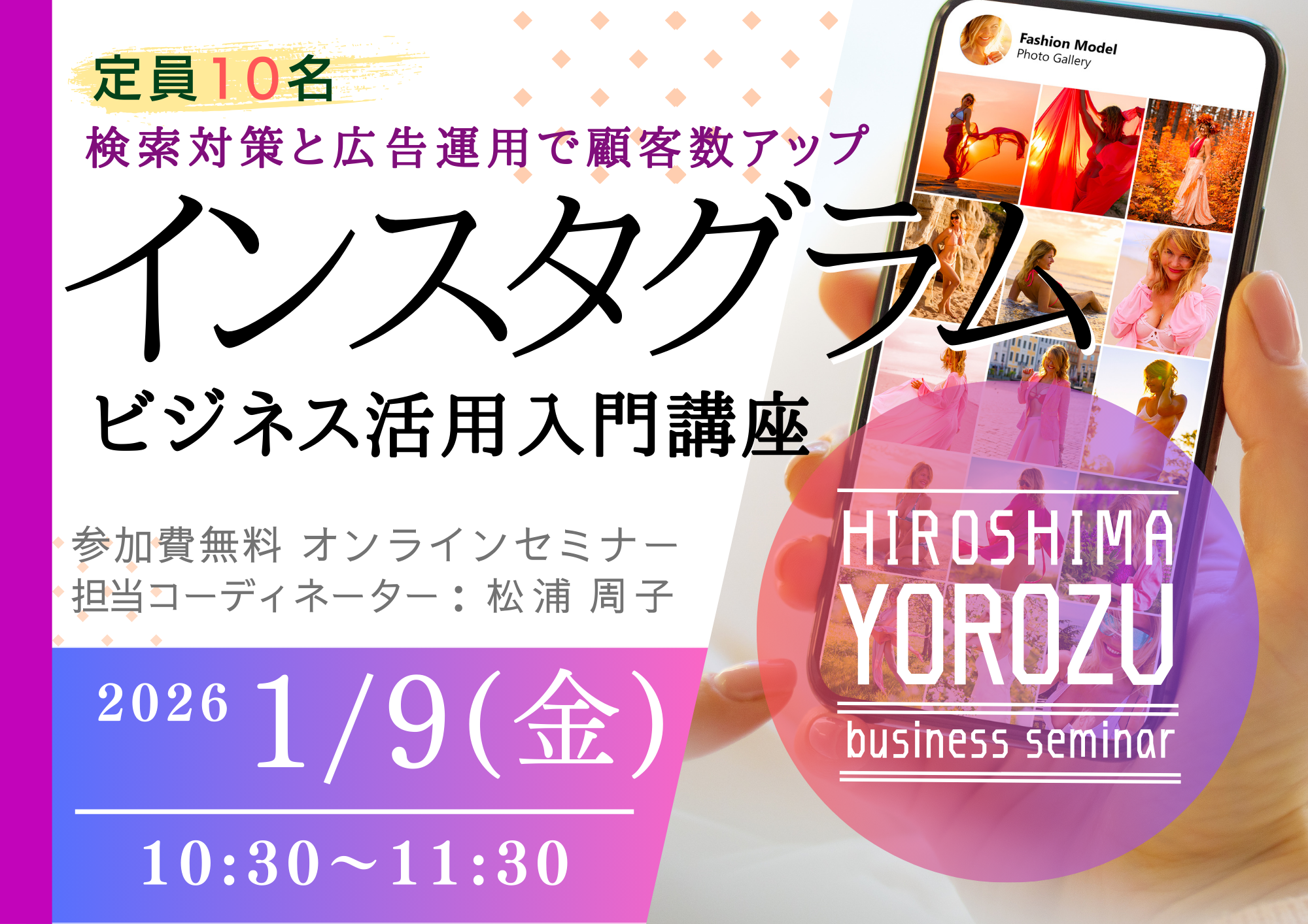集客・販売・情報発信に欠かせないインスタグラムを効果的にビジネスに導入するための入門セミナー。顧客を増やすための検索対策や広告活用について解説します。